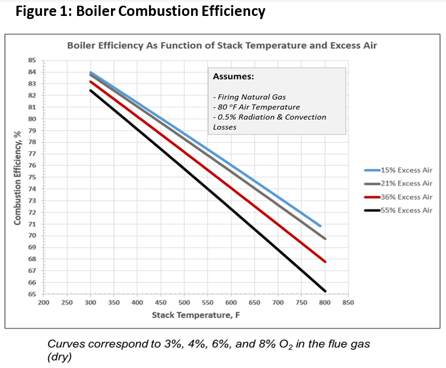 The first common signs that your boiler may need maintenance are elevated stack temperatures at the same firing rate and operating steam pressure or hot water temperature. Figure 1 shows the relationship between stack temperature, excess air (oxygen or O2 in the flue gas), and combustion efficiency.