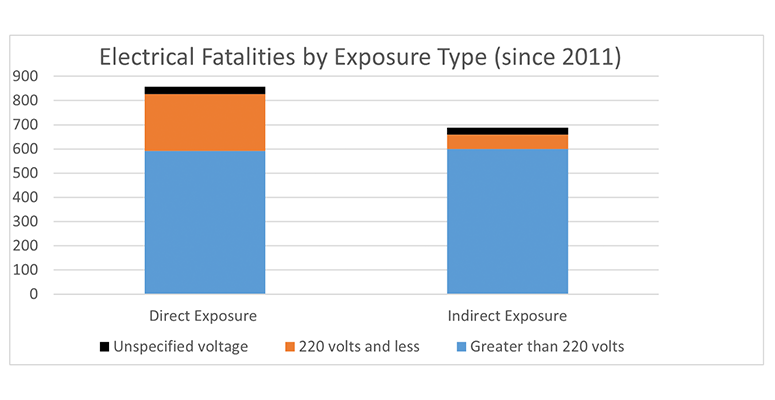 Exposure to electricity has been associated with 1,653 fatalities since 2011, according to the BLS. Of those fatalities, 858 were reported to be due to direct contact while 688 were reported as due to indirect contact. The following chart shows the total fatalities associated with each type as well as the voltage associated with those fatalities since 2011.
