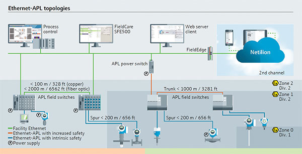 Ethernet-APL architecture is highly customizable, requiring only a gateway and power supply to enable data transfer among a wide range of instruments and various host systems using a single two-wire shielded cable per instrument. All figures courtesy of Endress+Hauser