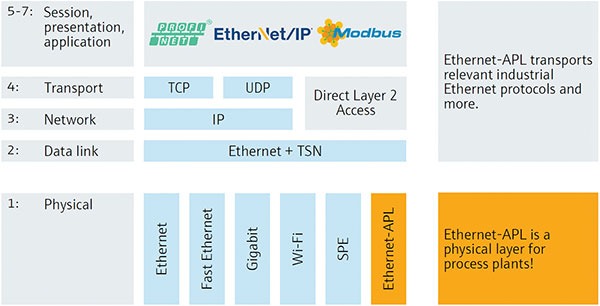 As a foundational transport layer, Ethernet-APL is capable of carrying any industrial Ethernet protocol. Endress+Hauser Ethernet-APL instrumentation currently supports PROFINET traffic, with plans to carry EtherNet/IP, Modbus TCP, and additional protocols in the near future.