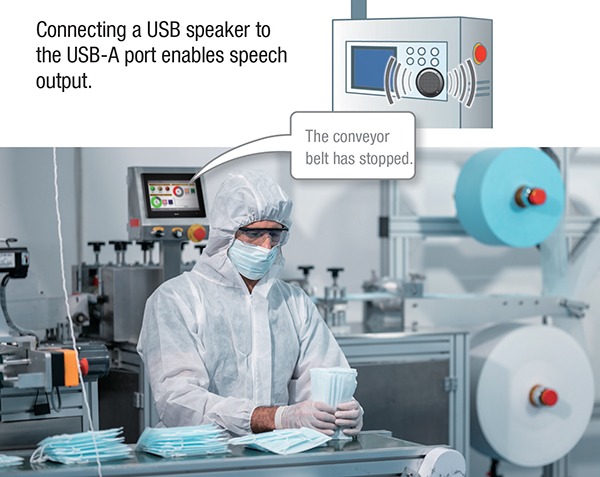 Expansive connectivity provides more design options. For instance, a USB-connected speaker can provide speech output notifications, so workers can receive touchless status updates.