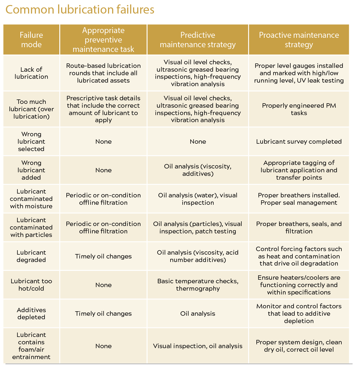 Table 1 shows the 10 most-common lubrication failures, from lack of lubrication to lubricant contamination. While some are more common than others in specific industries, developing a robust strategy to address each failure mode through appropriate preventive, predictive, and proactive maintenance is key.