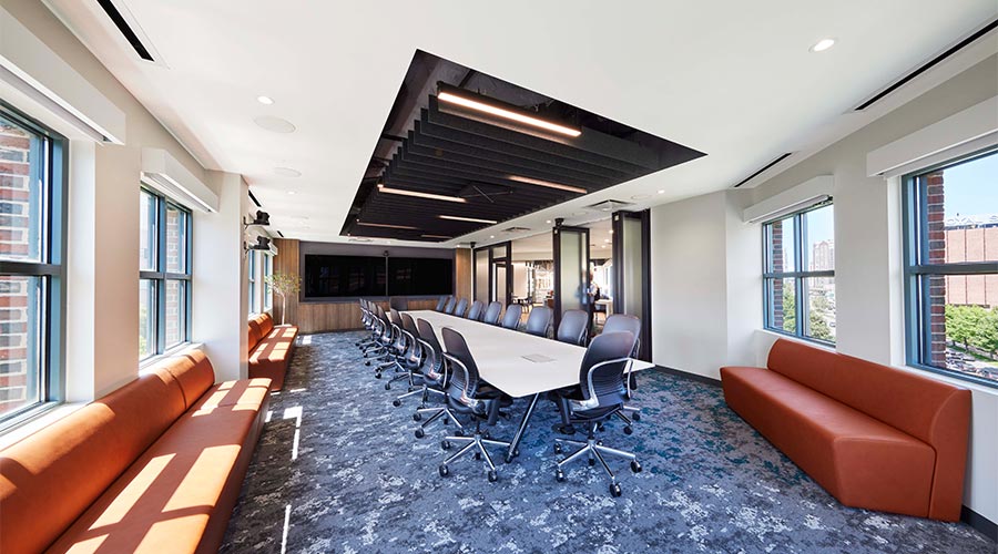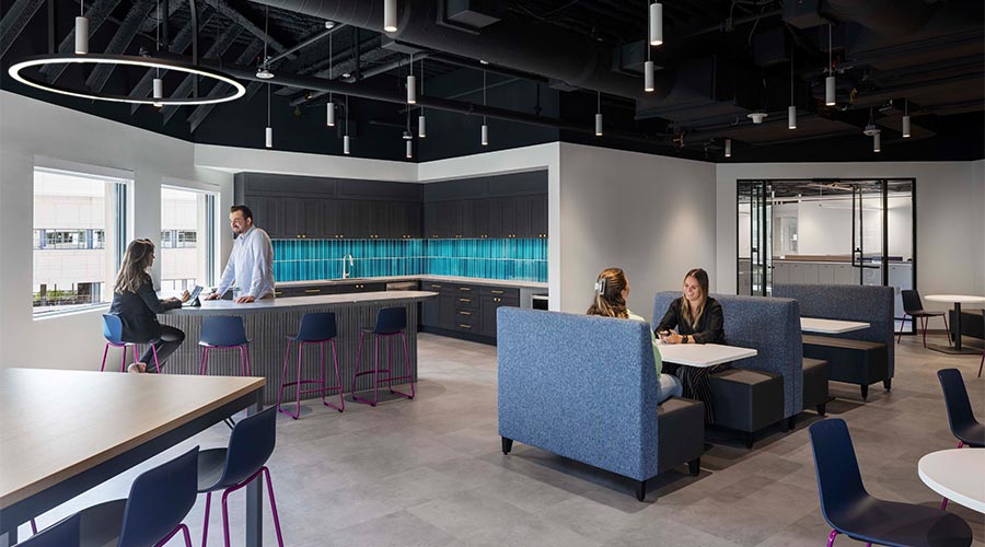 Hospitality-inspired cafes and lounges deploy comfort, color, and texture to support employee engagement. The spaces provide moments of respite, opportunities for socialization and room for casual events.