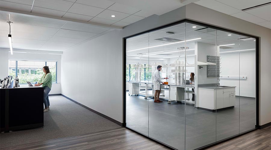 Conference rooms, touchdown zones, phone booths, and private offices hug internal walls to take advantage of the natural light pouring in from the perimeter. In conjunction with glass partitions, this also further empowers ‘science on display.’