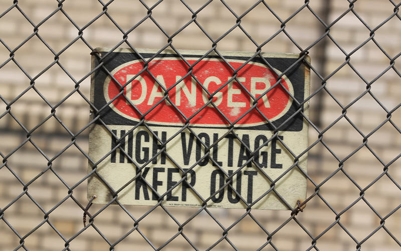Typically, the electrical room or vault access doors are locked to prevent access by unqualified persons, or those doors must be under continuous observation. The doors to these areas are required to open in the direction of egress and be equipped with panic hardware or listed fire exit hardware that opens upon simple pressure. For installations over 1,000 volts, nominal, these locked or monitored rooms, enclosures, or vaults must have a warning sign on the door reading, “DANGER – HIGH VOLTAGE – KEEP OUT.”