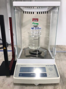 This balance, fitted with a density-determination kit, is part of a simple test to determine lubricant compatibility with elastomer O-rings.