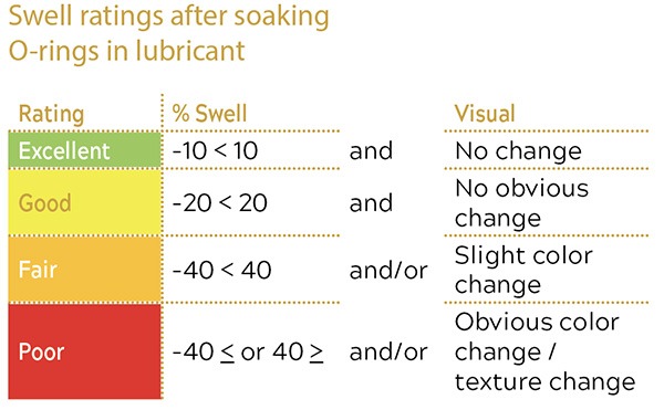 A simplified test can be conducted to evaluate compatibility where a lubricant is evaluated against an elastomer O-ring. This method involves soaking O-rings of various materials, such as buna-nitrile, EPDM, silicone, and PTFE, in the lubricant of choice in an oven set at 125 C for three days. The dry and wet mass of each O-ring before and after exposure is measured using an analytical balance fitted with a density determination kit. The method calculates the volume swell (ΔV%) by using the initial mass and the mass after exposure. A visual inspection is also performed to assess compatibility. This test method determines compatibility between a lubricant and elastomer under exposure conditions. The swell between O-rings may or may not be easily seen while, in some cases, it can be significant.