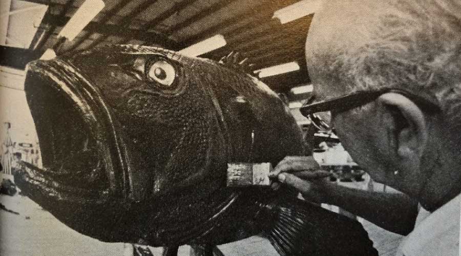 Mr. Sea Bass gets a touch-up in the paint shop. Underwater figures are repainted every three months to 1 and a half years.