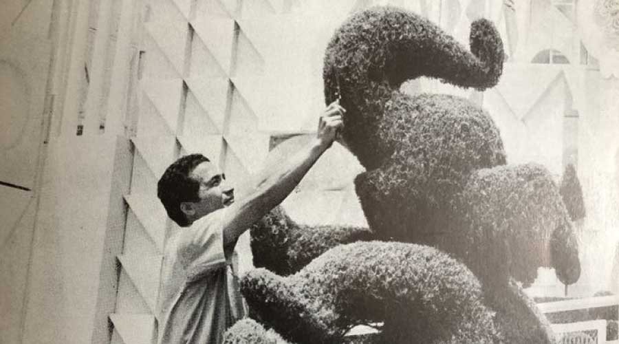 Although Disneyland is virtually a botanical garden in its own right some of the most unusual plants in the Magic Kingdom are the 22 delicate topiary shrubs which garnish the forecourt of “It’s a Small World.” Constantly trained in the shape of fanciful animal figures these living sculptures must be given frequent and precise pampering. Too much, or too little, water, fertilizer or insecticide can reduce three to five years of work to kindling wood almost overnight.