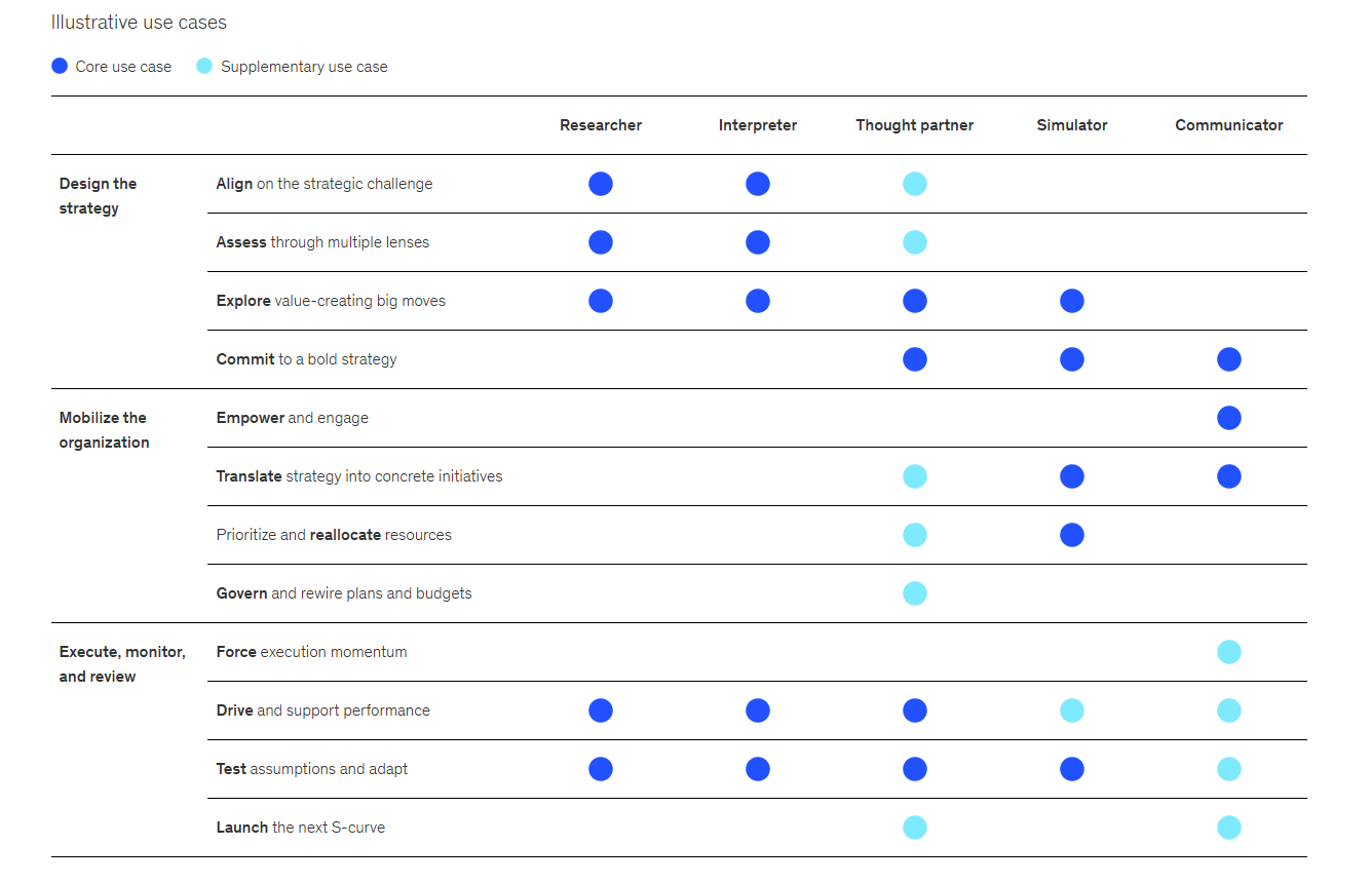 - Thought partner. AI can also serve as a brainstorming partner, speeding up idea generation and countering business leaders’ potential biases or blind spots. Gen AI in particular can help strategists avoid common pitfalls by assessing their plans against established frameworks. For example, a team can pressure test a strategy—both before and during its execution—by leveraging gen AI to play a challenger role to highlight potential hidden pitfalls or management blind spots.