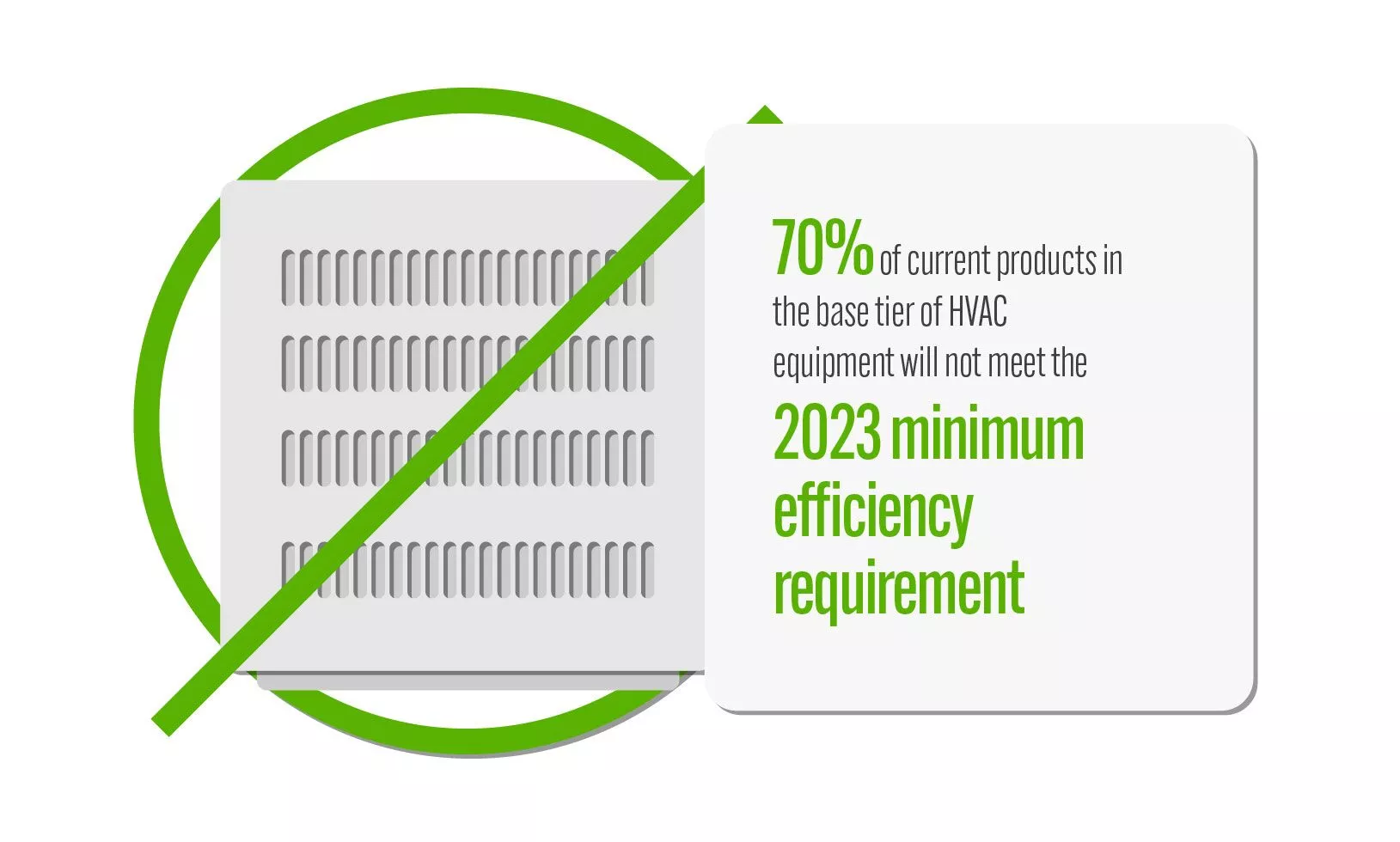 Figure 2: As of 2023, the Department of Energy has enacted a new nationwide efficiency mandate for HVAC equipment — referred to as SEER2. It is estimated that 70% of current products in the base tier of HVAC equipment will not meet the 2023 minimum efficiency requirement. Courtesy: Jordan & Skala Engineers