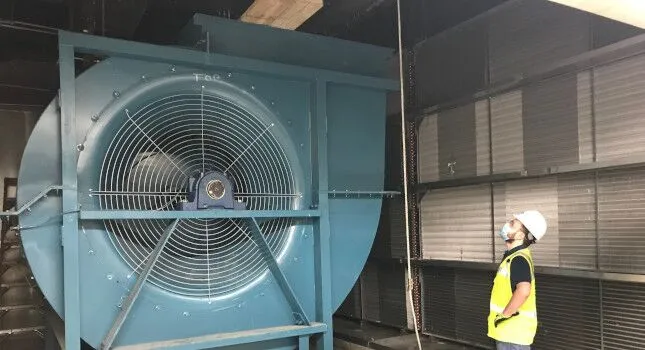 This shows an inside university custom air handler, supply air fan and cooling coil1-2 sentence, which can help create comfortable temperatures year-round. Courtesy: CDM Smith.