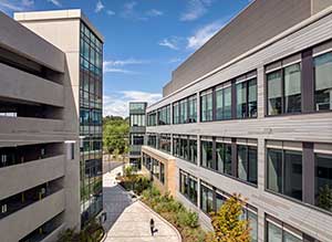 To create an inviting atmosphere, the exterior exudes warmer tones than typical lab buildings, featuring wood grain porcelain tiles and a tritone facade that extends onto the garage tower, tying the two together.