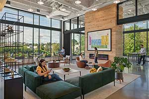 Serving primarily as a public-facing reception and lounge space, the lobby at Revolution Labs juxtaposes a comfortably upscale living room with high ceilings and industrial architecture. Biopheilia elements include a fireplace and plenty of natural light and visibility of exterior plantings from a 15-foot exterior curtain wall.