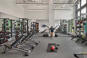 To support employee health, the facility is equipped with a locker room, free weights, aerobic machines, and space for ground work. Single-user Gender Neutral shower rooms have been integrated to support inclusivity within the fitness space.