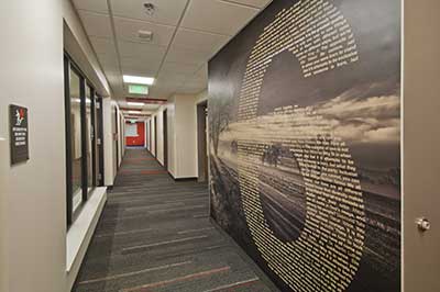 Wayfinding at Williams Village East residence hall at the University of Colorado-Boulder uses graphics that feature photography of local Boulder nature destinations which are also mapped out on a full-scale wall map in the hall’s first-floor game room.