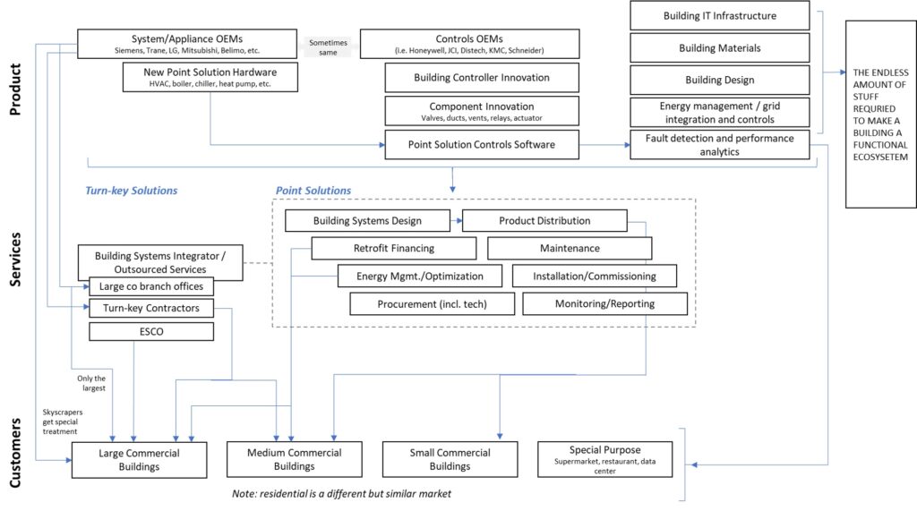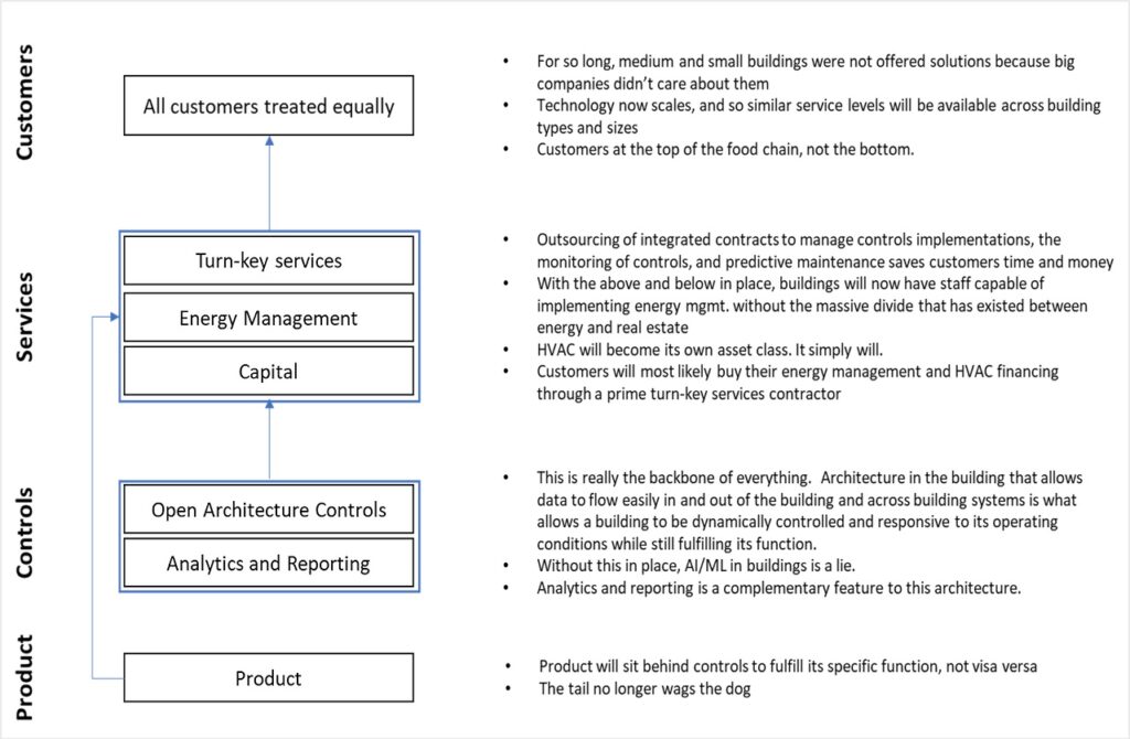 Unlike the dominance of auto manufacturers, a messy value chain has kept building equipment suppliers from achieving the same market chokehold. There has been a massive divide between energy and real estate. Customers sat at the bottom of the food chain as products dictated options and controls, and large providers often ignored medium and small buildings.