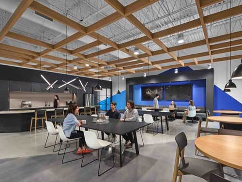 Shared areas such as the breakroom, game room and restrooms feature tech-inspired, hospitable aesthetics and graphics. One memorable flourish is the trellis-like, wood-hued grid overhead in the breakroom.Â