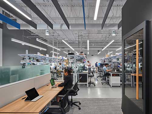 Crisp and clean design elements enhance the sophisticated lab and research environments as well as enclosed offices and collaboration zones. In the collaboration zones, horizontal acoustic blades in dark finishes hang from the exposed ceiling, adding eye-catching interest while cutting down on noise.Â
