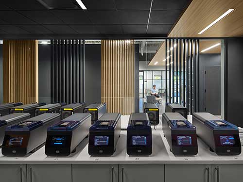 The instrument farm is a showpiece workspace of more than 60 devices used in Quantum-Si’s research, as well as a microscope room, machine shop, and clean room for the company’s laser team. Other enclosed zones accommodate specialized areas for robotics, and tissue culture work.Â