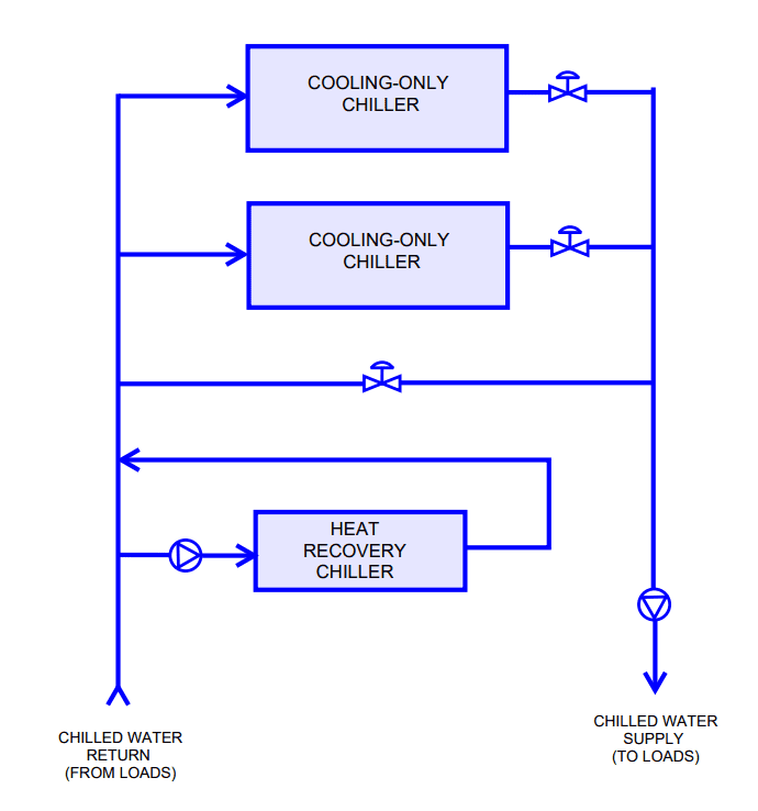 There are other possible piping arrangements for incorporating a heat recovery chiller with cooling-only chillers — this side stream arrangement minimizes the lift on the heat recovery chiller and allows it to be fully loaded when the cooling-only chillers are not.
