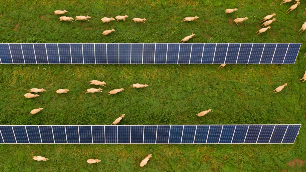 In a meadow in southwestern Germany, solar panels stand upright in long, thin lines, like a series of fences. While farmers raise hay in the wide spaces between rows, the vertical power plant generates carbon-free electricity for the nearby town. Across the border in France, both wine and watts flow from panel-topped vineyards. Tea grows under solar panels in Japan, while pollinators are nurtured in the United States. And from Canada to Australia, utility-scale solar farms producing power for thousands of homes share their space with sheep.