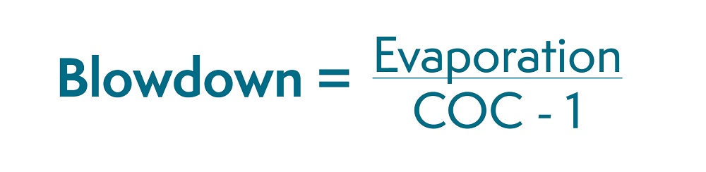 Using a pretreatment system to reduce the water’s dissolved ion concentration and corresponding conductivity may allow a facility to safely increase the operating cycles of concentration. Higher operating cycles of concentration lowers blowdown water volume, which can reduce total water usage (blowdown equation shown below).