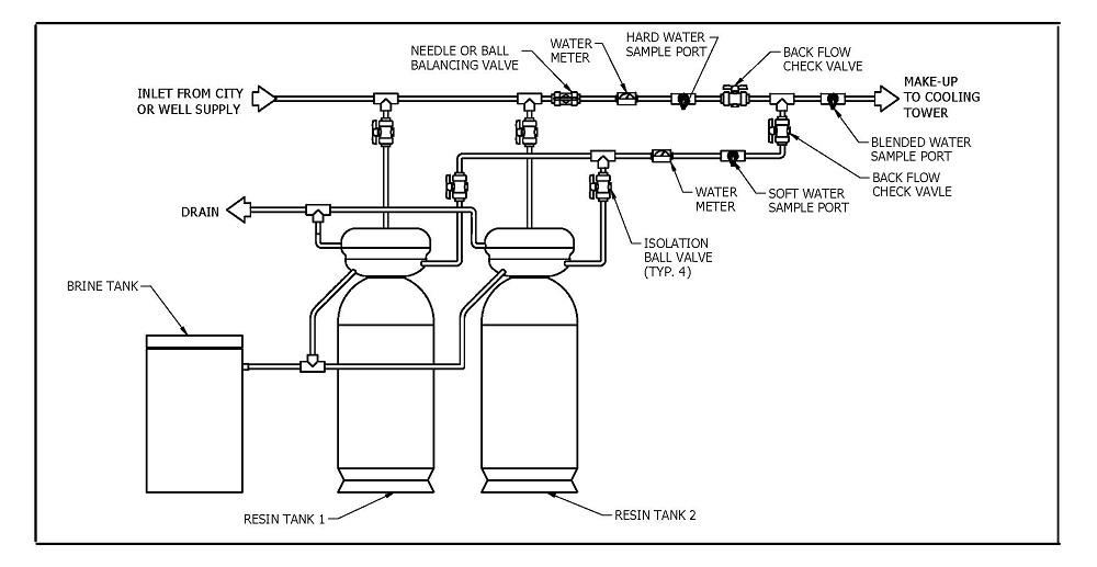 Some vendors recommend “soft water” to minimize scale potential and increase operating cycles of concentration. Softeners exchange calcium and magnesium hardness with sodium. Using split-stream softening to reduce total hardness can be an appropriate option when hardness is the primary limiter of cycles of concentration. Makeup water sources high in alkalinity, chloride, silica, or sulfate limit the effectiveness of softeners to increase operating cycles of concentration and save water.