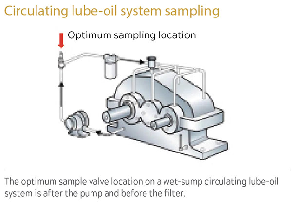 For greatest impact, dry-sump circulating systems should ideally be set up with multiple sample points that can be used to measure wear, contamination, and oil health. For oil health, install a sample point at the mid-point in the oil reservoir, purely for measuring oil condition. A second set of sample valves should be located immediately downstream of pumps and bearings. This location will be the most effective at detecting active machine wear. While not practical for systems with lots of bearings, such as paper machine lube-oil systems, for systems such as turbo-compressors and steam turbines, which may have four to six bearings, this is a reasonable proposition, given that these larger systems are often critical assets.