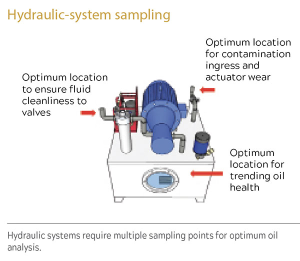 Dry-sump circulating systems should be sampled from the return line, downstream from oil-lubricated components. For hydraulic systems, which often contain return-line filters, the sample point should be located upstream of the filter.