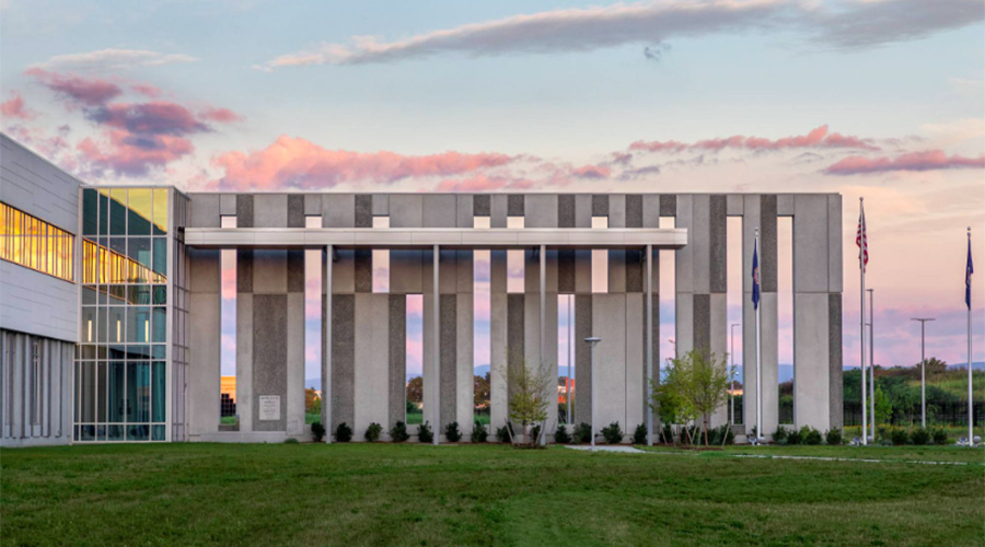 The FBI Central Records Complex in Winchester, Virginia, has landscaped areas that draw attention away from a security fence and bollards, toward an elegant main entry.