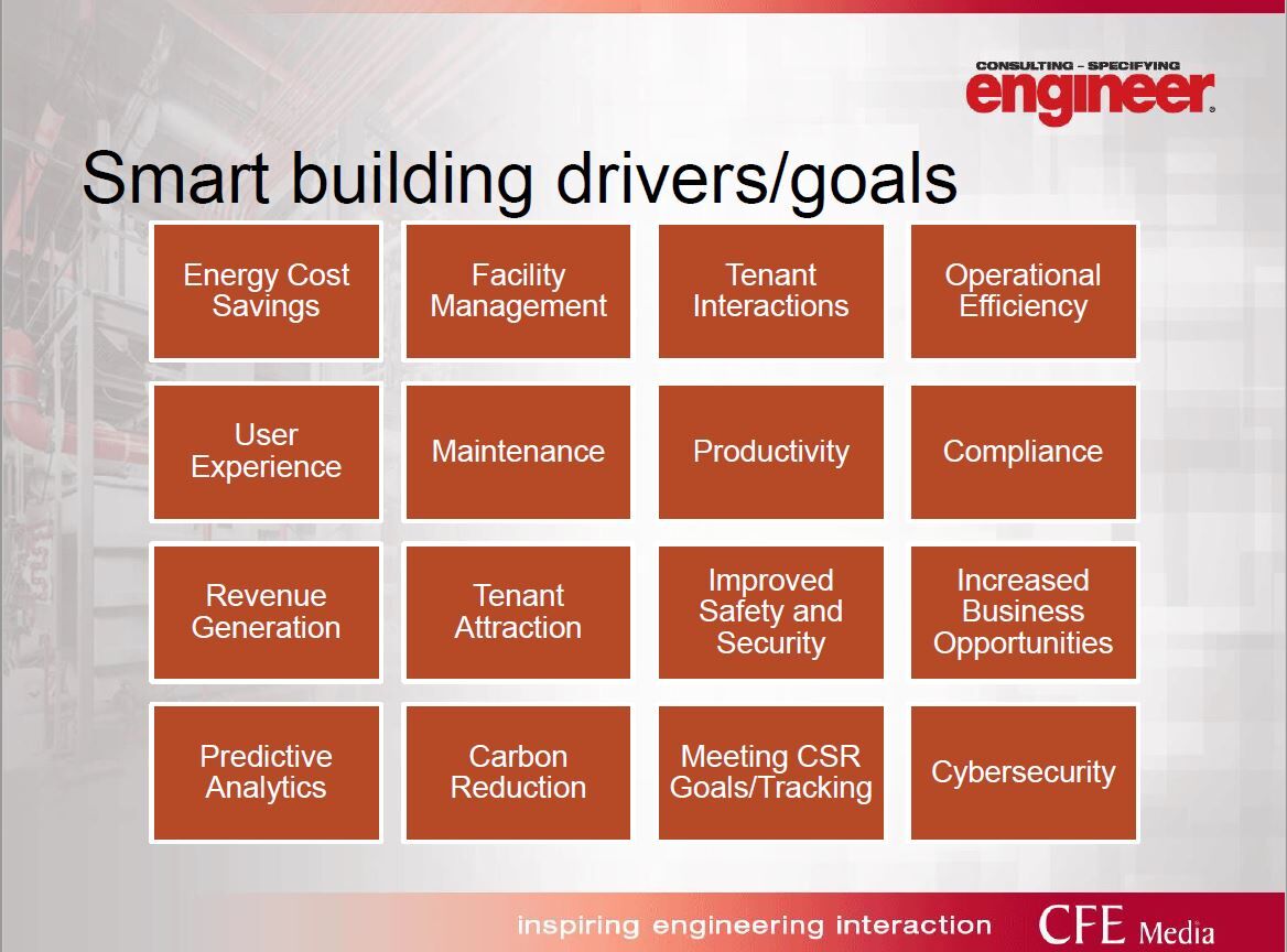 Smart buildings have many drivers, many of which are based on the type of client. Courtesy: Consulting-Specifying Engineer