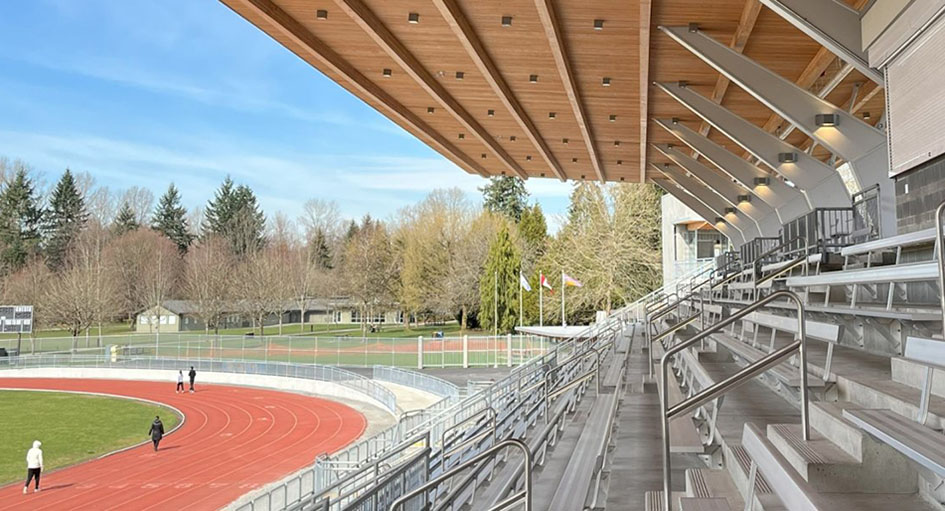 The Bear Creek Stadium grandstand in Surrey is now complete. The $24 million project includes 2,200 covered seats, changerooms, washrooms, meeting rooms, officials’ rooms, concession stand and box office.