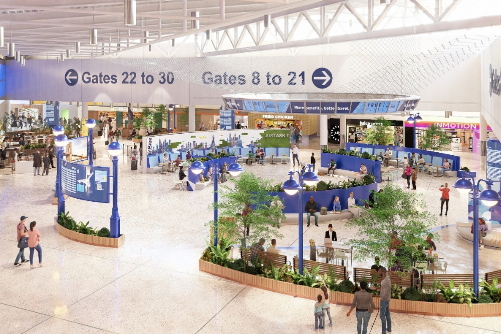 Interesting tidbit: At the heart of Terminal 5, the center concourse will transform into a space inspired by New York City’s famous parks. Lush greenery, park benches, concrete chess tables, and warm lighting will provide city park charm for customers to relax before their next flight. Additionally, an art collection will feature more than 30 works by local artists, and new concessions will include local food and beverage options. JetBlue’s Terminal 5 refresh aligns with the Port Authority’s $19 billion transformation of JFK Airport, which includes past “Under Construction” winners such as the $9.5 billion New Terminal One project, the $4.2 billion Terminal 6 project, and New York’s largest on-site solar-plus-storage project.