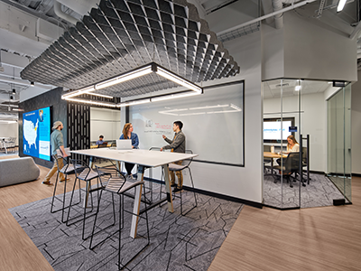 Huddle rooms set at the back of the main open area offer moveable tables and chairs for four-to-six occupants set inside transparent enclosures. Above the collaborative areas, the design team reorganized exposed mechanical systems, highlighting the visible underside of the ceiling deck and ductwork with clean finishes resulting in a modern industrial aesthetic.Â