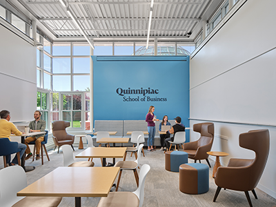 Aligning the space with Quinnipiac University’s forward-thinking approach to education and career development, the design team introduced studying and socializing zones, huddle rooms, and redesigned classrooms and a computer lab. These inviting and technologically advanced spaces showcase student accomplishments and become a highlight of tours for visitors and prospective students.