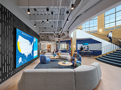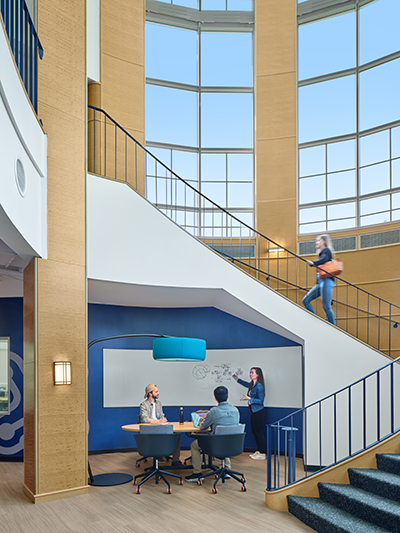 The grand staircases flank the triple-height space for socializing and small group work. The flexible environments foster community and showcase student work, which encourages others to visit the lounge to see what’s being accomplished.Â