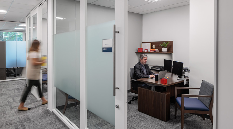 Office space offers calm and welcoming spaces while also emphasizing security and sensitivity.